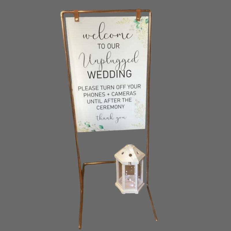 Copper Stands for Hanging Welcome Boards or Seating Plan. With leather straps. (2 available) Suitable for acrylic or wooden signs. Size - Inside measurements 62cm w x 150cmH
