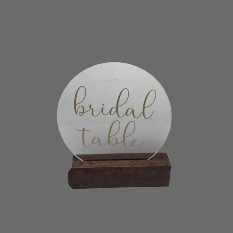 Bridal Table Sign - Round Clear with Gold Writing on Wooden Stand (1 available)