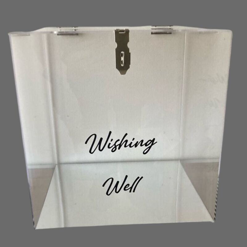Wishing Well - Clear Acrylic with Silver Base. 30cm x 30cm With lock and key. Black ‘Wishing Well’